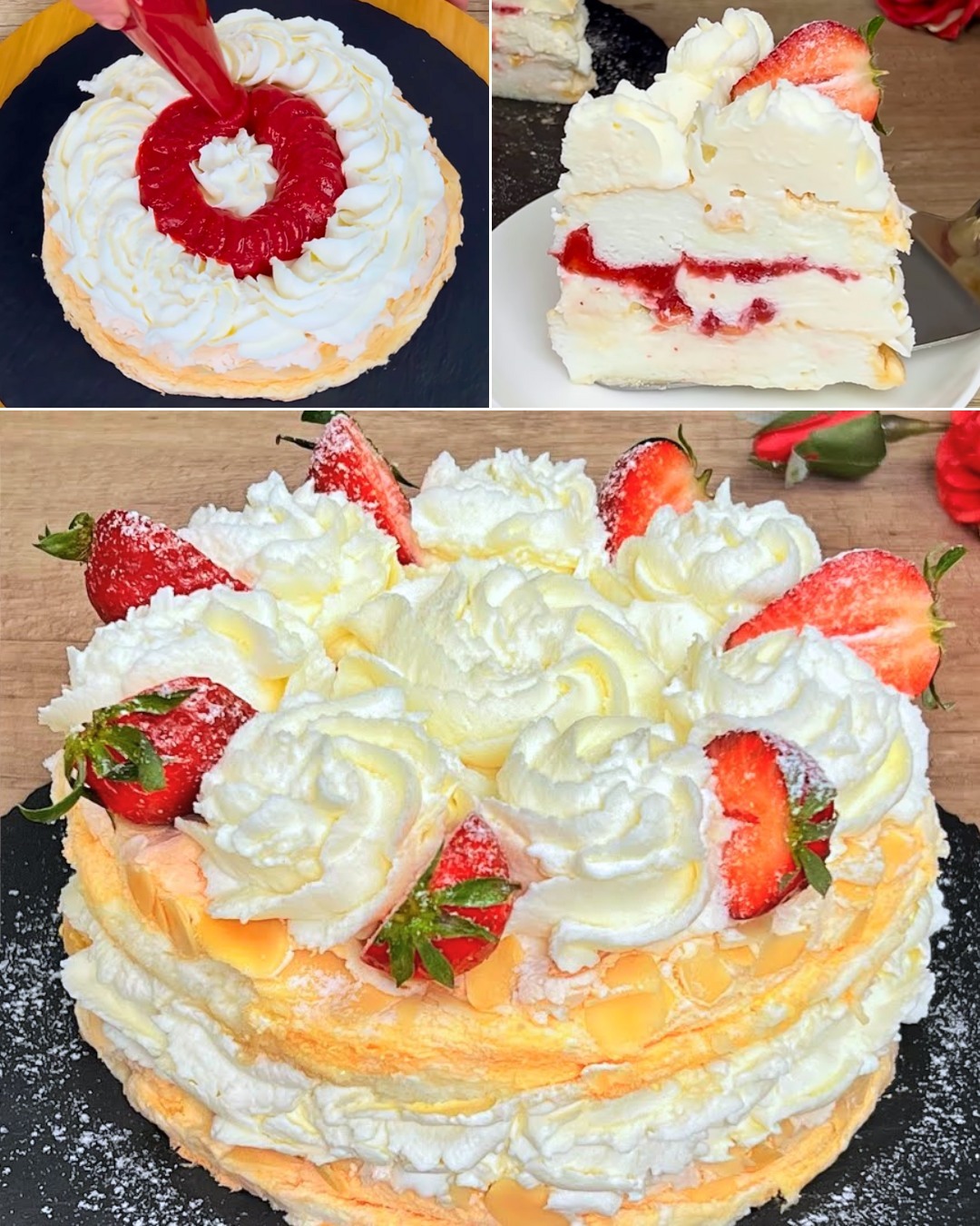 Questa torta deliziosa e facile da preparare presenta strati di panna montata e una deliziosa farcitura di fragole.