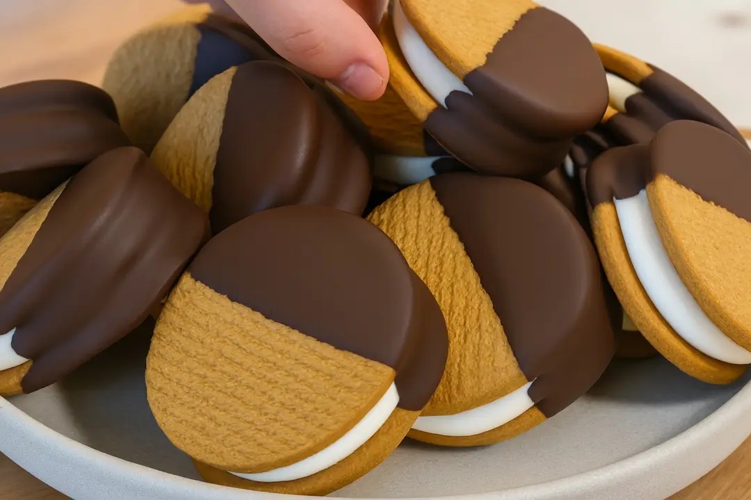 Montate la panna e aggiungete il latte condensato. Farcite i biscotti e metteteli in freezer per 6 ore. Sciogliete il cioccolato e immergete metà di ogni biscotto congelato.