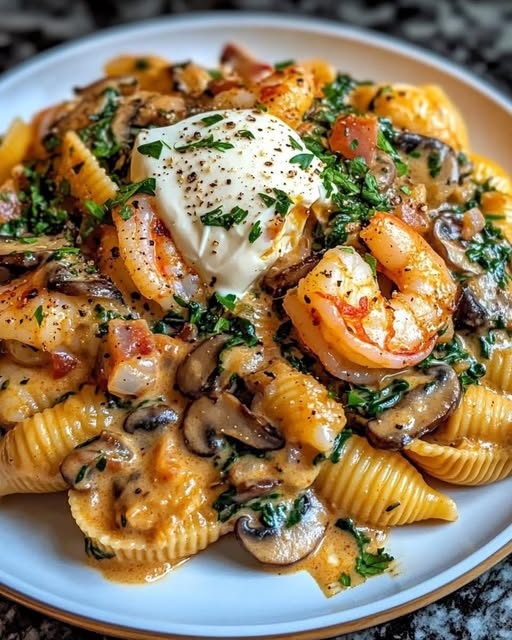 Conchiglie di gamberi cremose con spinaci e funghi: burrose, agliate e assolutamente confortanti!