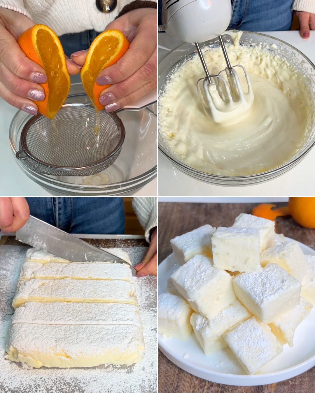 I marshmallow sono dei dolcetti zuccherati tipici statunitensi che la nostra Melissa preparerà con solo 2 ingredienti: gelatina e succo d’arancia. Per realizzare questi soffici e deliziosi marshmallow all’arancia, abbiamo sciolto i fogli di gelatina nel succo d’arancia, prima di frullare il tutto per ottenere un composto spumoso. Versalo poi in uno stampo e lascia raffreddare in frigo, prima di ricavare i nostri cubetti di marshmallow super morbidi. Ecco come prepararli.