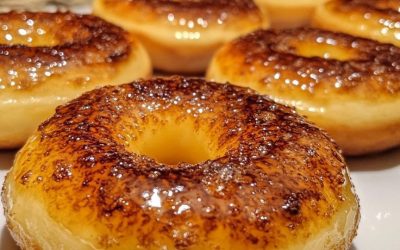 Ciambelle alla crema bruciata: potrebbe contenere: ciambelle glassate appoggiate su un piatto bianco accanto a un piano cottura nero. Ciambelle…