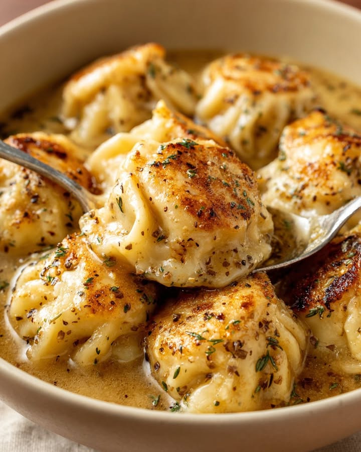 Questi ravioli si sposano perfettamente con fagiolini al vapore o un'insalata verde croccante, che creano un delizioso contrasto con i sapori intensi. Per un tocco di comfort in più, serviteli con una cucchiaiata di purea cremosa di cavolfiore, che si sposa perfettamente con la salsa saporita. Un bicchiere di vino bianco fresco o una tisana leggera completeranno perfettamente questo pasto, ideale per una serata accogliente a casa.