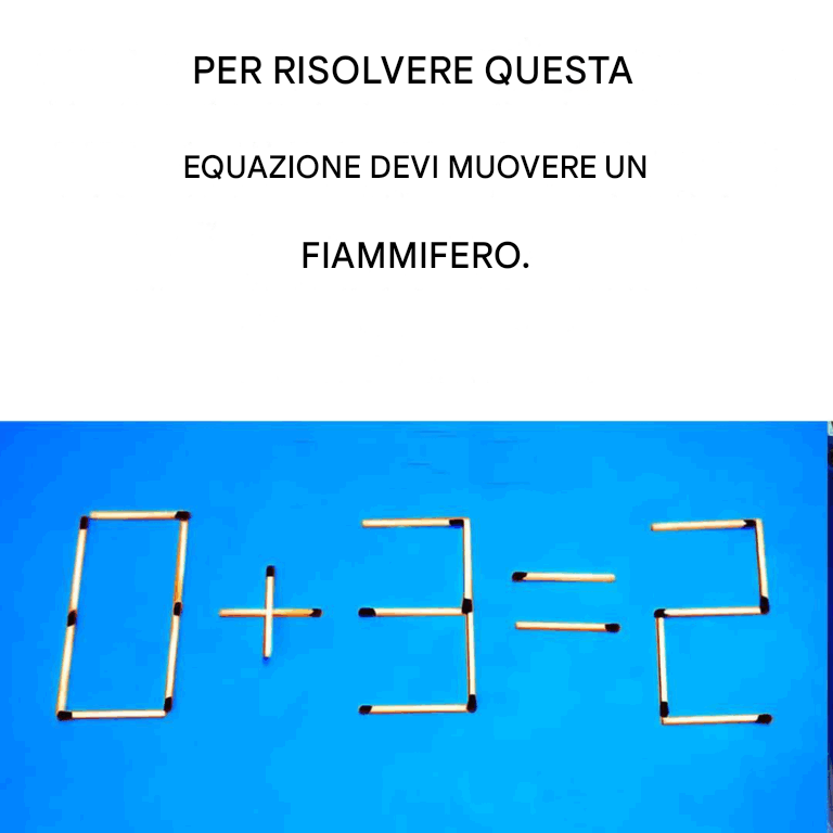 Questa addizione è semplicissima. Non serve essere maestri del calcolo mentale per sapere che 0 + 3 non fa 2. Quale elemento pensi debba essere trasformato per ottenere la risposta corretta? Questa è l'occasione perfetta per mettere alla prova la tua attenzione ai dettagli e le tue capacità deduttive. Concentrati completamente su questa operazione e prova a risolverla spostando solo un piccolo fiammifero.