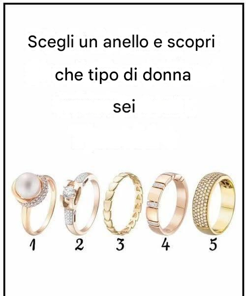 Dai un’occhiata ai cinque anelli nell’immagine qui sopra e scegli quello che ti rappresenta immediatamente. Non esitare, scegli l’anello più adatto a te. Dopo aver fatto la tua scelta, leggi la descrizione qui sotto per scoprire cosa dice la tua scelta sul tipo di donna che sei.